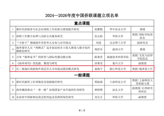 近日,2024-2026年度中国侨联课题立项结果揭晓,地理环境与科学学院姜海宁教授主持的“长三角地区高校海外高层次人才回流动因及模式研究”课题喜获重点课题立项。