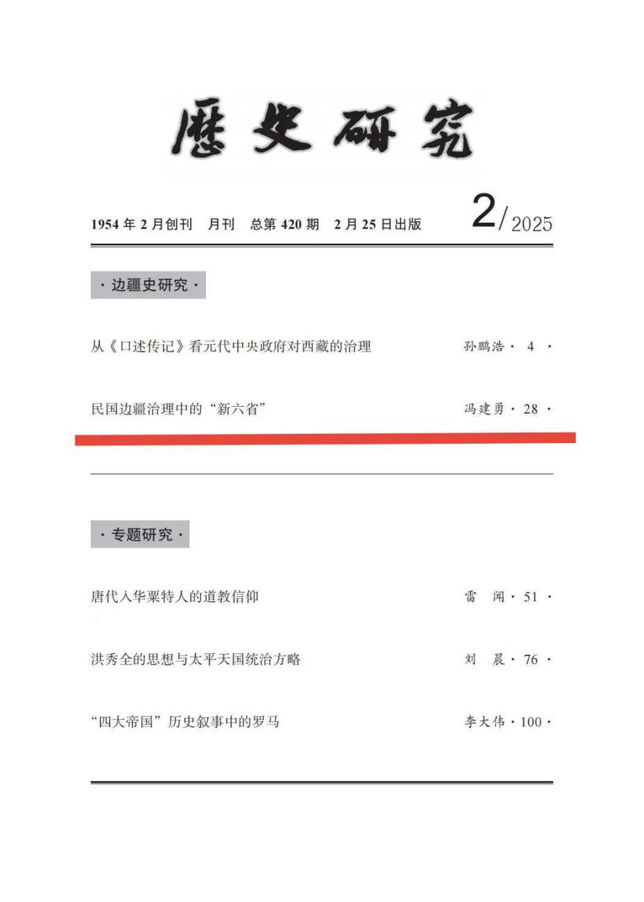 近日,人文学院中国史学科冯建勇教授在2025年第2期《历史研究》发表专题论文《民国边疆治理中的“新六省”》,此文系中国历史研究院“兰台青年学者计划”项目“民国时期边疆治理通论”(2022LTQN603)阶段性成果;亦受中国历史研究院《(新编)中国通史》“中国疆域史卷”项目资助。