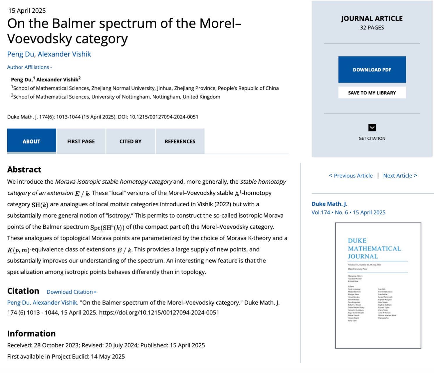 近日,数学科学学院教师杜鹏与英国诺丁汉大学的Alexander Vishik教授合作的论文On the Balmer spectrum of the Morel–Voevodsky category在著名数学期刊Duke Mathematical Journal上发表,全讯600cc大白菜官网为第一完成单位。