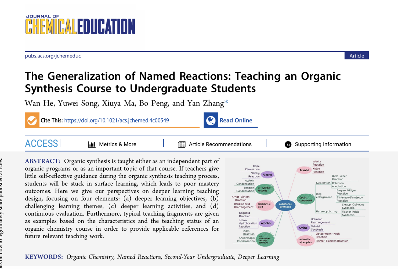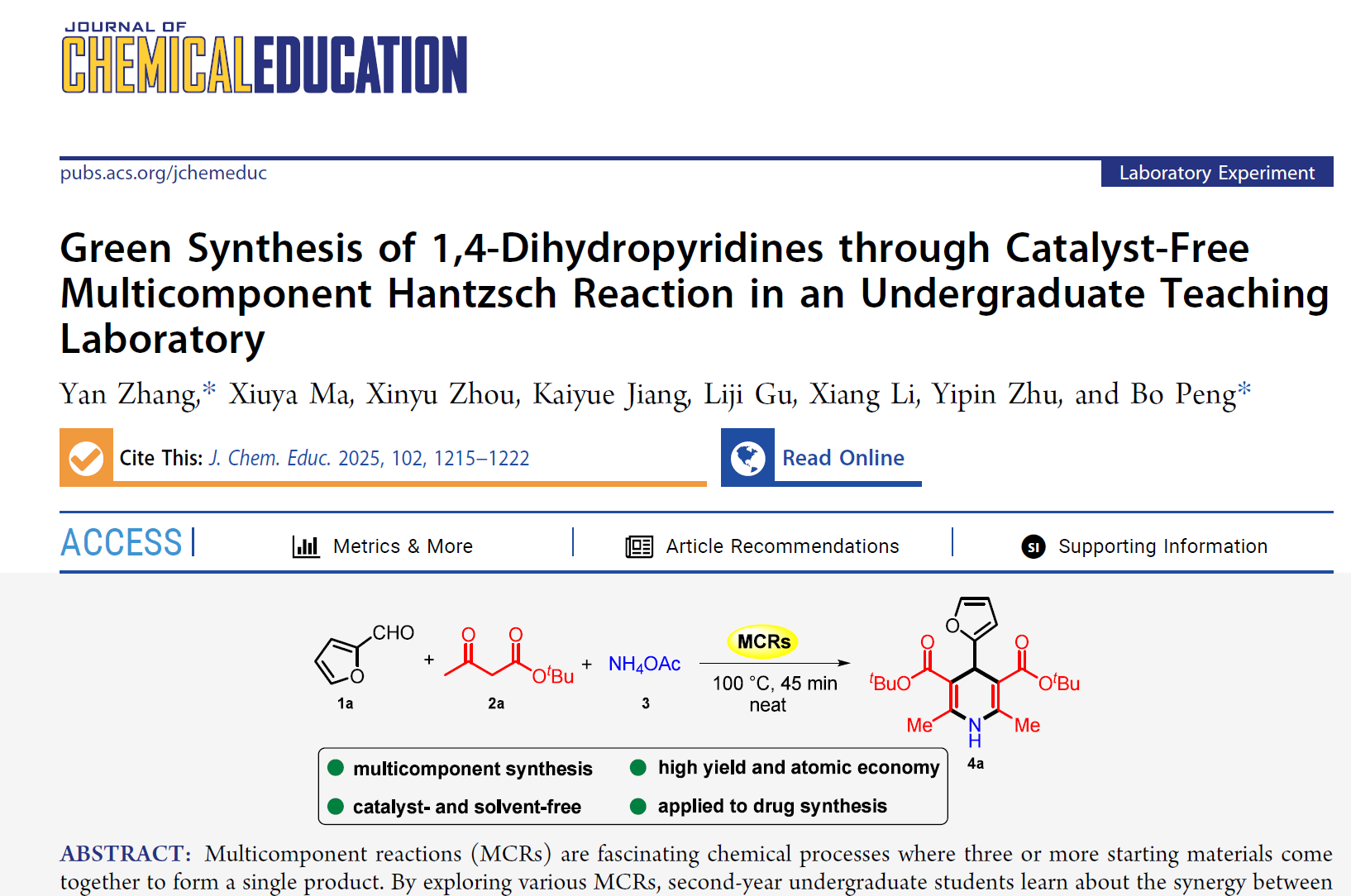 近日,化材学院张岩副教授、彭勃教授团队在国际化学教育领域顶级期刊Journal of Chemical Education连续发表两篇教学研究论文,分别题为“The Generalization of the Named Reactions: Teaching Organic Synthesis Course to Undergraduate Students”(J. Chem. Educ. 2025, DOI:org/10.1021/acs.jchemed.4c00549)以及“Green Synthesis of 1,4-dihydropyridines through Catalyst-Free Multicomponent Hantzsch Reaction in An Undergraduate Teaching Laboratory”(J. Chem. Educ. 2025, 102 (3), 1215–1222.)。