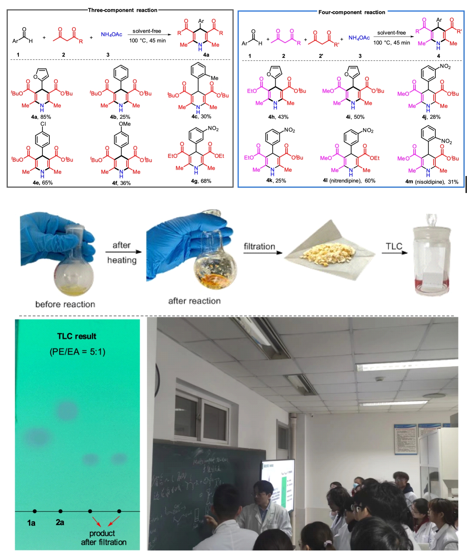 第二篇论文则聚焦实验教学改革,设计了绿色化学实验——通过无催化剂多组分Hantzsch反应合成1,4-二氢吡啶类化合物,将绿色化学理念融入本科实验教学,提升了实验教学的现代化水平。
