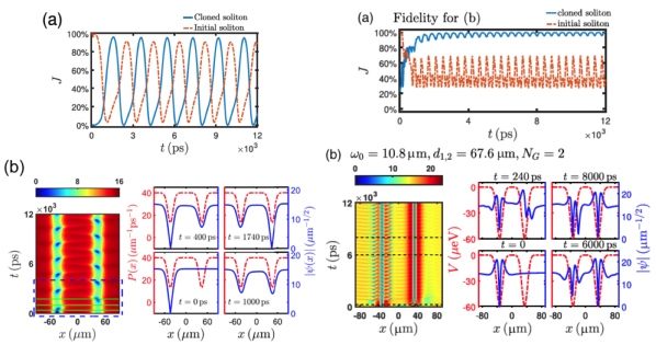 论文1和2研究了激子极化子凝聚体中的暗孤子克隆。通过调控空间泵浦光和空间外势,实现了周期型的孤子克隆和剪切型的孤子克隆,得到了一种全新的动态稳定解,即呼吸暗孤子组。揭示了激子极化子的增益损耗效应以及孤子间的相互作用是实现克隆的必要条件。除此以外,还可以通过调控泵浦光和外势的强度、距离、和数量来方便的调控孤子克隆。