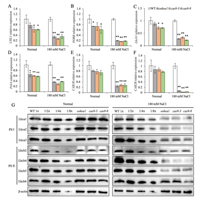 功能预测显示OsKEA1编码一个定位在叶绿体的钾离子外排反向转运蛋白。通过对各株系在盐胁迫下的钾钠离子含量测定显示,oskea1功能丧失突变体在盐胁迫下的钾钠离子含量和比例失衡。组织化学染色和H2DCFDA探针标记显示,oskea1功能丧失突变体在盐胁迫下的ROS含量积累。进一步的ROS含量和酶活测定显示,oskea1功能丧失突变体在盐胁迫下的ROS含量积累,ROS清除酶活性紊乱。高盐离子影响植物叶绿体的超微结构,导致叶肉细胞肿胀。透射电镜分析显示,oskea1功能丧失突变体在盐胁迫下的叶绿体减少且形态异常,类囊体排列松散,嗜锇颗粒增多。WB分析显示,突变体光系统相关蛋白积累减少,光系统被破坏。
