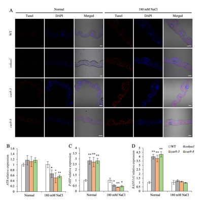 同时,TUNEL实验显示,oskea1的功能丧失会导致水稻盐胁迫下的DNA受损加剧,并且DNA修复和复制的功能紊乱。该研究揭示了水稻应对盐胁迫的适应性机制,同时暗示了OsKEA1作为耐盐遗传改良的关键靶点,为培育高抗盐水稻品种提供理论支撑。