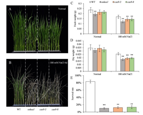 该研究从粳稻武运粳7号为背景的突变体库中筛选到一个盐敏感的水稻突变体oskea1,该突变体在盐胁迫下叶片枯萎卷曲,存活率降低。