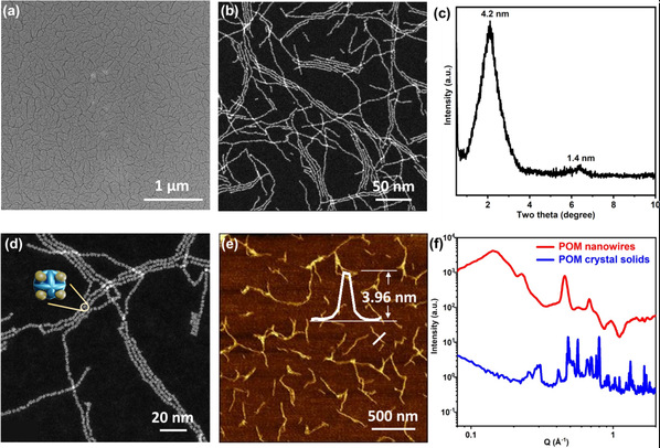 图2. POM纳米线的形貌和表征:(a)大尺度TEM图像。(b)POM纳米线的STEM图像。(c)POM纳米线的SAXRD图谱。(d)具有宏观单POM簇的AC-HAADF-STEM图像。(e)通过AFM观察的POM纳米线高度。(f)POM纳米线和晶体固体的SAXS曲线。