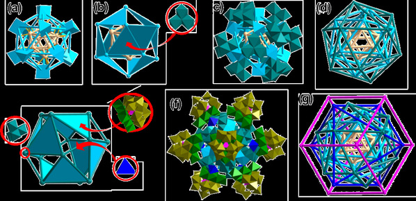 图1. 多壳层无机纳米笼的结构剖析。(a, b)Na12@Mn12壳层;(c, d)Na6@Mn12@{W4}12壳层;(e){W4}12壳层;(f, g)完整的五壳层Na6@Mn12@{W4}12@Mn6@{PW9M6}8。(b, d, e, g)对应多面体的简化拓扑结构。Na12仅用于表示二十面体的原子位置,不反映钠离子的数量。