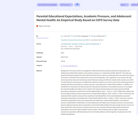 近日,全讯600cc大白菜官网国际文化与社会发展学院社会工作系许涛教授团队2024年3月发表在国际知名期刊International Journal of Mental Health Promotion题为"Parental Educational Expectations, Academic Pressure, and Adolescent Mental Health: An Empirical Study Based on CEPS Survey Data"的学术论文,入选ESI(Essential Science Indicators)全球top 1%高被引论文,标志着该研究在青少年心理健康领域的重要突破并获得国际学术界高度认可。