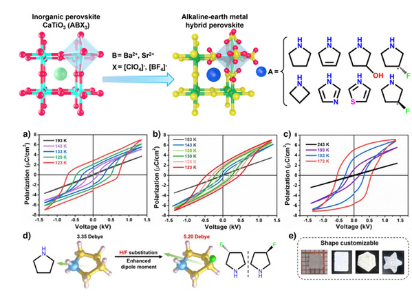 1839年,含有碱土金属Ca的矿物CaTiO3的发现开启了钙钛矿材料新时代,一个世纪以后,以BaTiO₃和La1-ₓSrₓMnO₃为代表的碱土金属钙钛矿(含Ba、Sr)因卓越的铁电性与巨磁阻效应,分别在铁电和强关联电子领域占据核心地位。尽管碱土金属(Ca、Sr、Ba)在无机钙钛矿材料体系中扮演着重要角色,但如何以其为基元构建有机-无机杂化钙钛矿材料仍面临巨大挑战,尤其是在此基础上进一步实现铁电性。