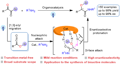 手性α羟基酰胺是多种天然产物、药物分子(如头孢孟多酯、Semagacestat、D-泛醇和BMS-270394等)及生物活性化合物中广泛存在的关键结构单元。然而,该类结构的不对称合成,尤其在无过渡金属参与的条件下,仍存在显著挑战。针对该问题,基于课题组在可见光诱导的Brook重排原位形成硅氧烯酮的前期研究工作基础之上,作者创新性地提出了可见光诱导的Brook重排策略与有机催化策略相结合,与胺类亲核试剂发生有机催化不对称加成反应,实现了手性α-羟基酰胺的高效构建。在该研究中,反应条件温和,底物适用范围广泛,可获得高收率(最高达98%)和优秀对映选择性(最高98% ee)的α-羟基酰胺类化合物。此外,该方法的底物使用范围可进一步拓展至氨基酸酯等,合成一系列手性氨基酸衍生物。作者将该产物进行深入的衍生化研究,包括已成功应用于AAK1抑制剂和药物BMS-270394的关键手性中间体的形式合成,体现了其在药物化学中的潜在应用价值。机理研究表明,通过哈密特方程分析推断反应决速步涉及正电荷积累过程;结合进一步的实验验证与DFT理论计算,证实质子转移步骤为反应的决速步。该工作不仅显著拓展了硅氧基烯酮在合成化学中的应用边界,也为手性α-羟基酰胺类化合物的高效、高选择性制备提供了新颖可靠的途径,具有重要的科学意义和应用价值。