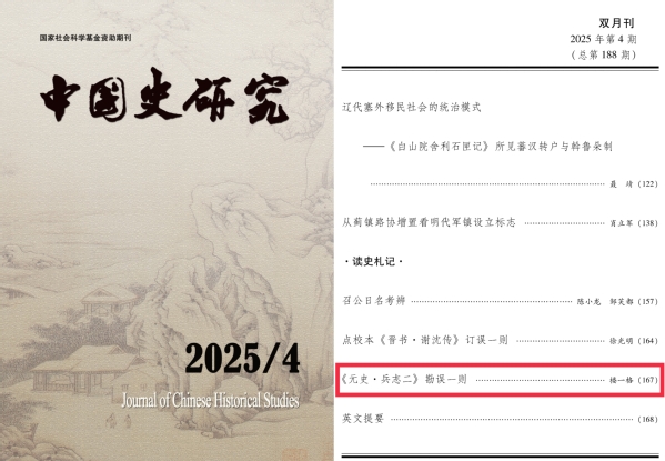 近日,全讯600cc大白菜官网边疆研究院教师、青年博士楼一格在《中国史研究》2025年第4期发表论文《〈元史·兵志二〉勘误一则》。