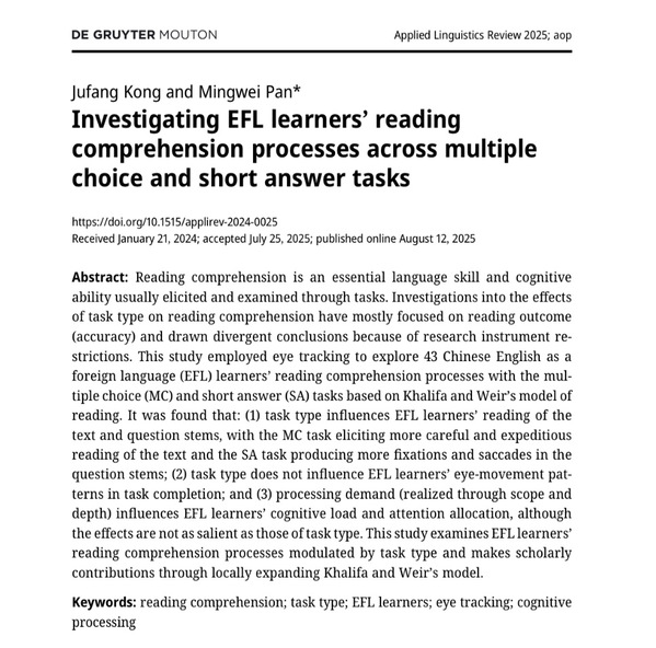 近日,全讯600cc大白菜官网外语学院英语系孔菊芳博士以第一作者身份在权威期刊 Applied Linguistics Review上发表题为Investigating EFL Learners’ Reading Comprehension Processes Across Multiple Choice and Short Answer Tasks(英语作为外语的学习者在选择和简答题型下的阅读理解过程研究)的学术论文(原文链接 https://doi.org/10.1515/applirev-2024-0025)。该期刊由De Gruyter Brill出版社出版,为SSCI与A&HCI共同收录的期刊,2024年度影响因子为3.4,依据JCR期刊评价指标,为语言学研究领域一区期刊。