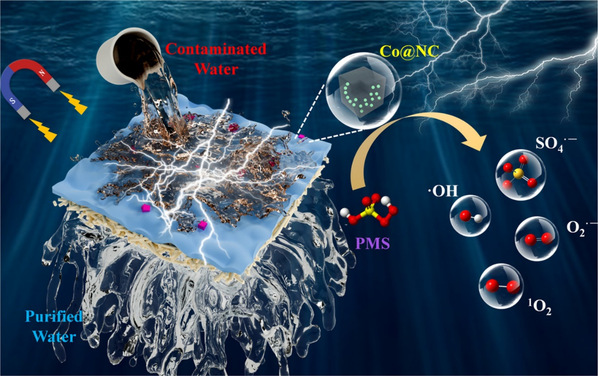 抗生素在水环境中的广泛残留,导致抗生素抗性基因和耐药菌的传播,已成为全球环境与公共健康的重大挑战。针对传统催化剂重复使用性差、质量传递效率有限等问题,该研究团队创新性地提出并构建了一种磁感应自组装的Co@NC改性电化学膜,实现了过一硫酸氢钾(PMS)的高效电催化活化与抗生素废水的快速净化。研究表明,该膜通过磁场作用实现Co@NC催化颗粒在膜表面定向富集,形成高密度活性位点;电场作用加速了Co2+/Co3+循环,大幅提升了催化效率。该论文图文摘要如下所示: