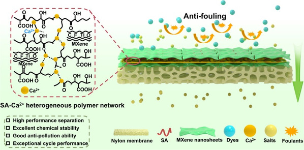 染料/盐废水严重危害环境与健康,其高效分离对资源回收和环境保护至关重要。膜分离技术虽具优势,但受限于膜污染导致的渗透性差、抗污能力弱等问题。二维材料MXene亲水性好但自组装膜稳定性不足。本研究利用海藻酸钠(SA)与Ca²⁺交联,制备新型MXene/SA复合膜。该膜形成稳定的“蛋盒”结构,增强机械性能和稳定性,构建均匀纳米通道,旨在实现高效染料/盐选择性分离,并提升抗污染能力,为解决现有膜技术瓶颈提供新策略。
