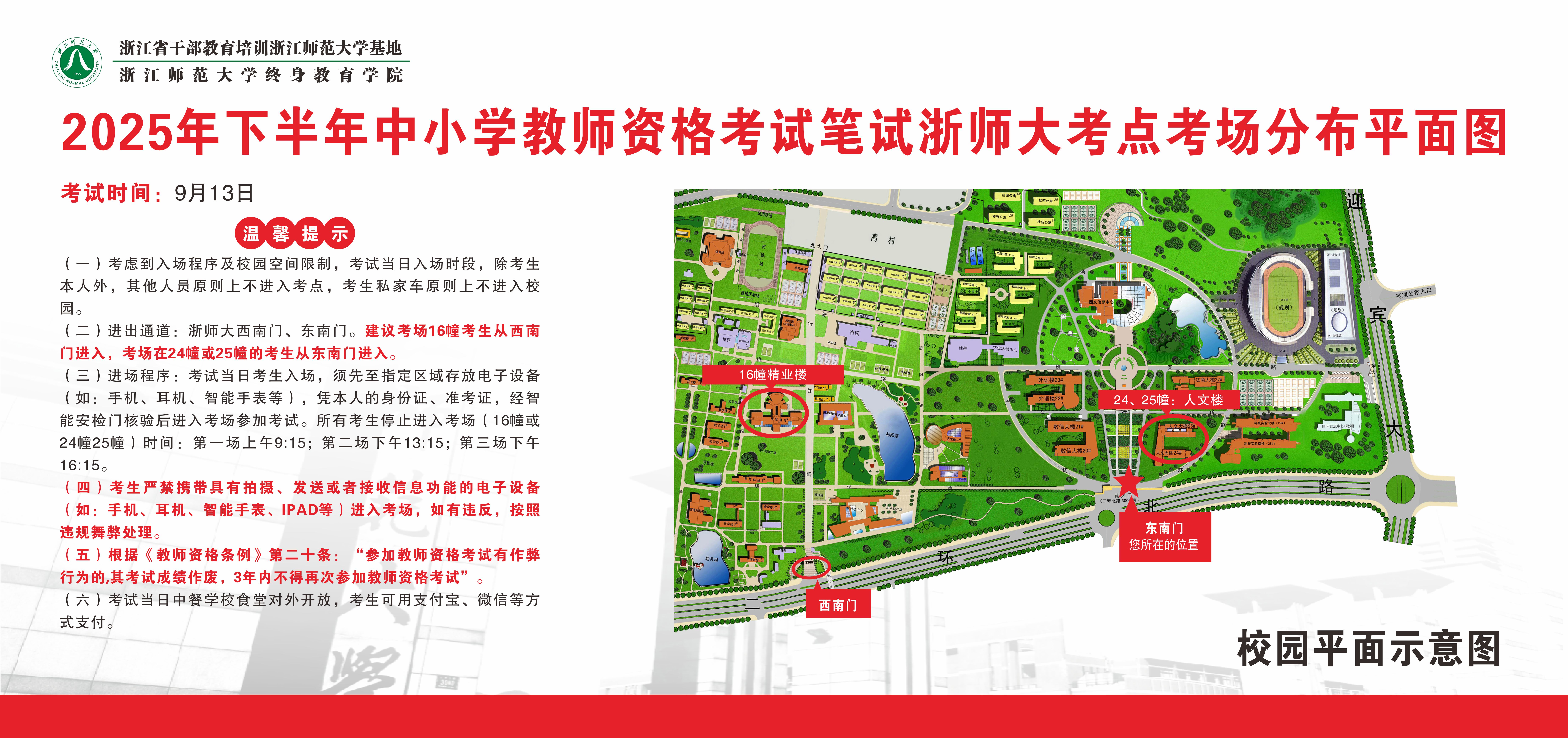 2.进出通道:浙师大西南门、东南门。建议考场16幢考生从西南门进入,考场在24幢或25幢的考生从东南门进入。