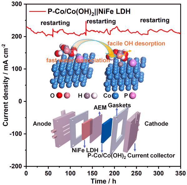 本研究利用次亚磷酸钠调控的一步电沉积法成功构建了富含P-Co/Co(OH)2界面的微球催化剂。这一创新性策略显著降低了羟基在异质界面的吸附,从而大幅增强了催化剂的电解稳定性。实验结果表明,所制备的P-Co/Co(OH)2催化剂表现出色,在电流密度为10 mA cm-2时仅需36.7 mV过电位(与铂基催化剂26.9 mV相近),远优于核壳结构对比样Co@Co(OH)2的217.6 mV。在250 mA cm-2的高电流密度下稳定运行55小时后,电流保持率高达97.1%,远超对照组的59.1%。当将P-Co/Co(OH)2与NiFe-LDH配对组装成碱性阴离子交换膜电解槽时,该系统仅需2.03 V电压即可驱动200 mA cm-2的电流密度,并实现了长达350小时稳定运行。这一结果充分体现了P-Co/Co(OH)2在工业级电解水制氢中的巨大应用潜力。通过理论计算、电化学测试和原位红外光谱深入研究表明,磷源诱导的异质结构显著加速了水解离动力学,并优化了氢吸附行为。同时,羟基吸附的减轻是提升稳定性的关键因素。该研究详细揭示了羟基吸附强度-稳定性之间的构-效关系,为设计高稳定性电解制氢催化剂提供了全新思路。