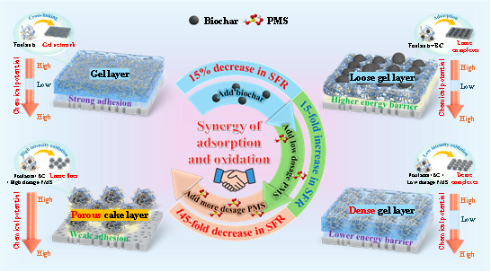 膜污染是限制超滤和纳滤等先进膜分离技术广泛应用的核心难题。如何在保持高效分离的同时,缓解有机物在膜表面形成致密污染层,是当前膜法水处理领域的前沿科学问题。针对这一挑战,该研究提出并系统揭示了生物炭(Biochar, BC)活化过硫酸盐(PMS)的预处理策略,通过氧化与吸附的协同作用,实现对膜污染的有效控制,并深入揭示了生物炭活化过硫酸盐预处理的多尺度热力学作用机制。该论文图文摘要如下所示: