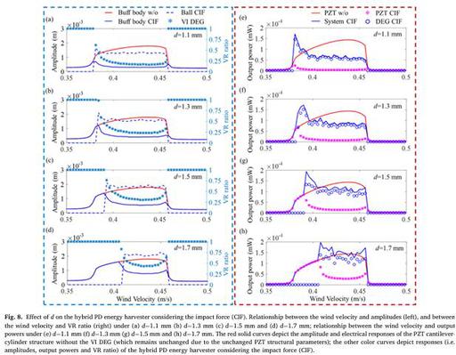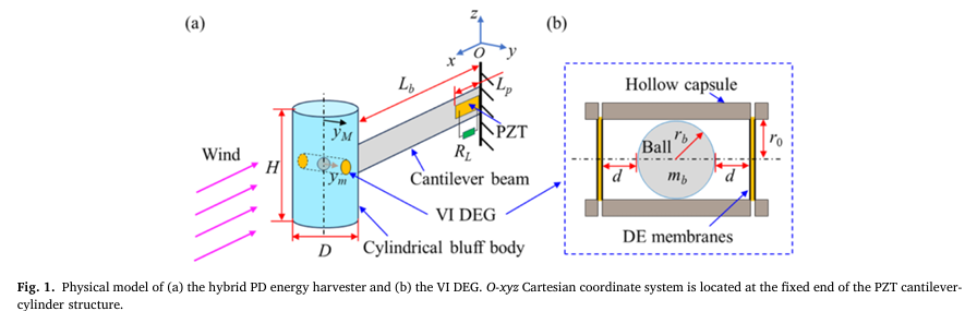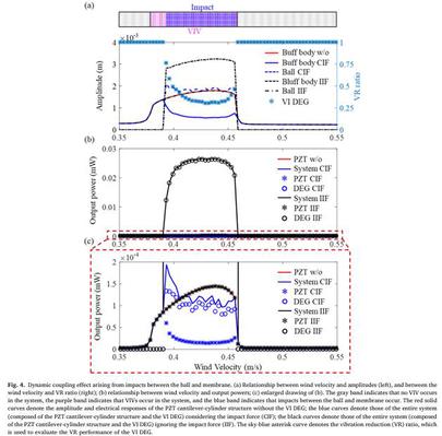 混合压电-介电(PD)能量俘获装置能够实现高性能收集风致涡激振动能。该装置由压电(PZT)悬臂梁-圆柱结构和嵌入钝体的振动冲击介电弹性体发电机(VI DEG)组成,通过双路径转换能量:PZT结构振动与VI DEG内部冲击。然而,现有研究忽略了冲击引发的动态耦合效应——该效应可能抑制PZT结构振动并降低系统能量俘获性能。为此,本文运用延伸的哈密顿原理构建了包含内部冲击力的精细化系统动力学模型,首次揭示了冲击导致的振动抑制与能量俘获性能退化现象。随后,系统性地分析了关键结构参数(如碰撞距离、介电弹性体薄膜预拉伸比、PZT结构等效质量、PZT结构等效刚度、钝体直径)对振动抑制和能量俘获性能的影响。