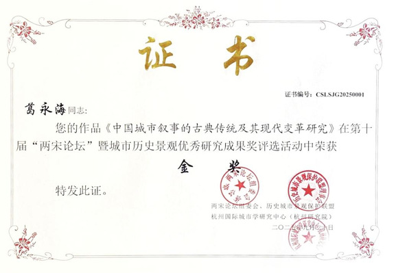 本次研究成果奖面向全国,评选近五年该领域的重要研究成果,共产生金奖1部(篇),银奖2部(篇),铜奖3部(篇),优秀奖5部(篇)。人文学院葛永海教授专著《中国城市叙事的古典传统及其现代变革研究》在评选中荣获金奖。
